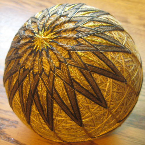The "Emperor" pattern from Barbara Suess' Japanese Temari book. This is the first temari I made using a 16-division and they needed to be pretty precise so the pattern wouldn't look lopsided. It's also the largest temari I've made to date, about 4" across, which actually made it hard to grip while embroidering.